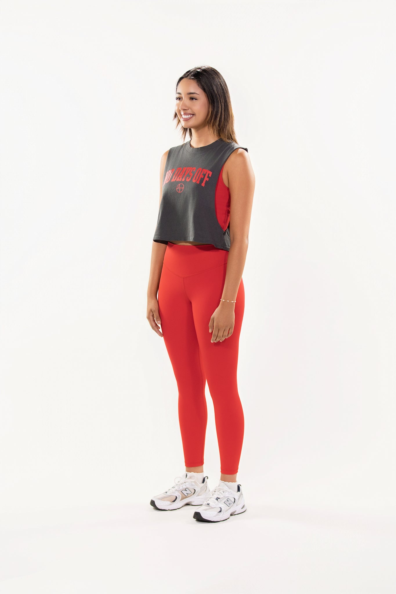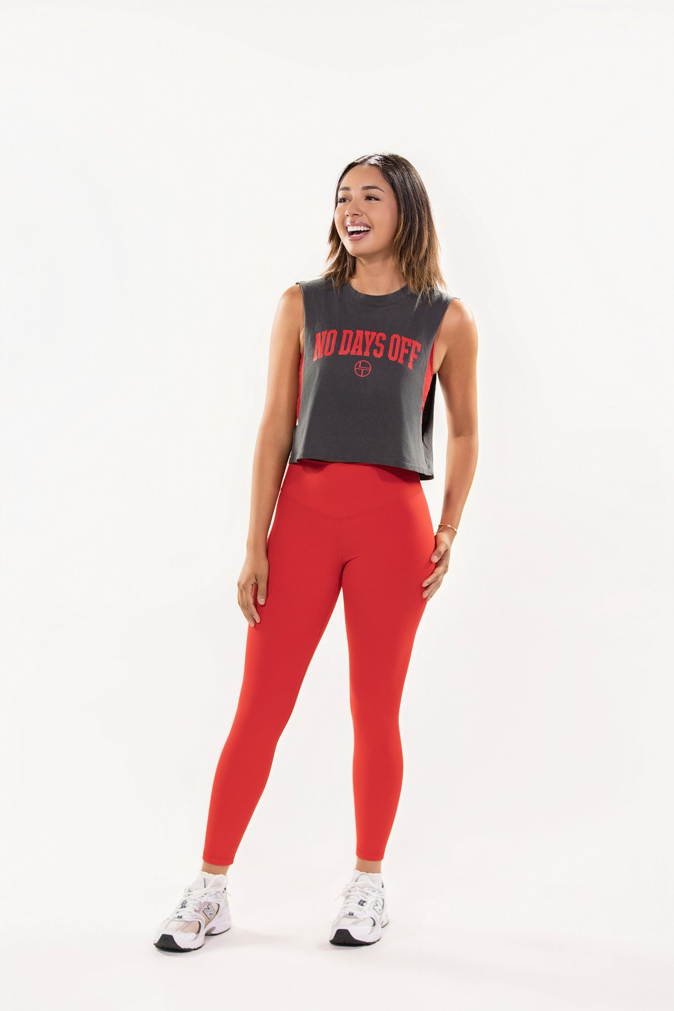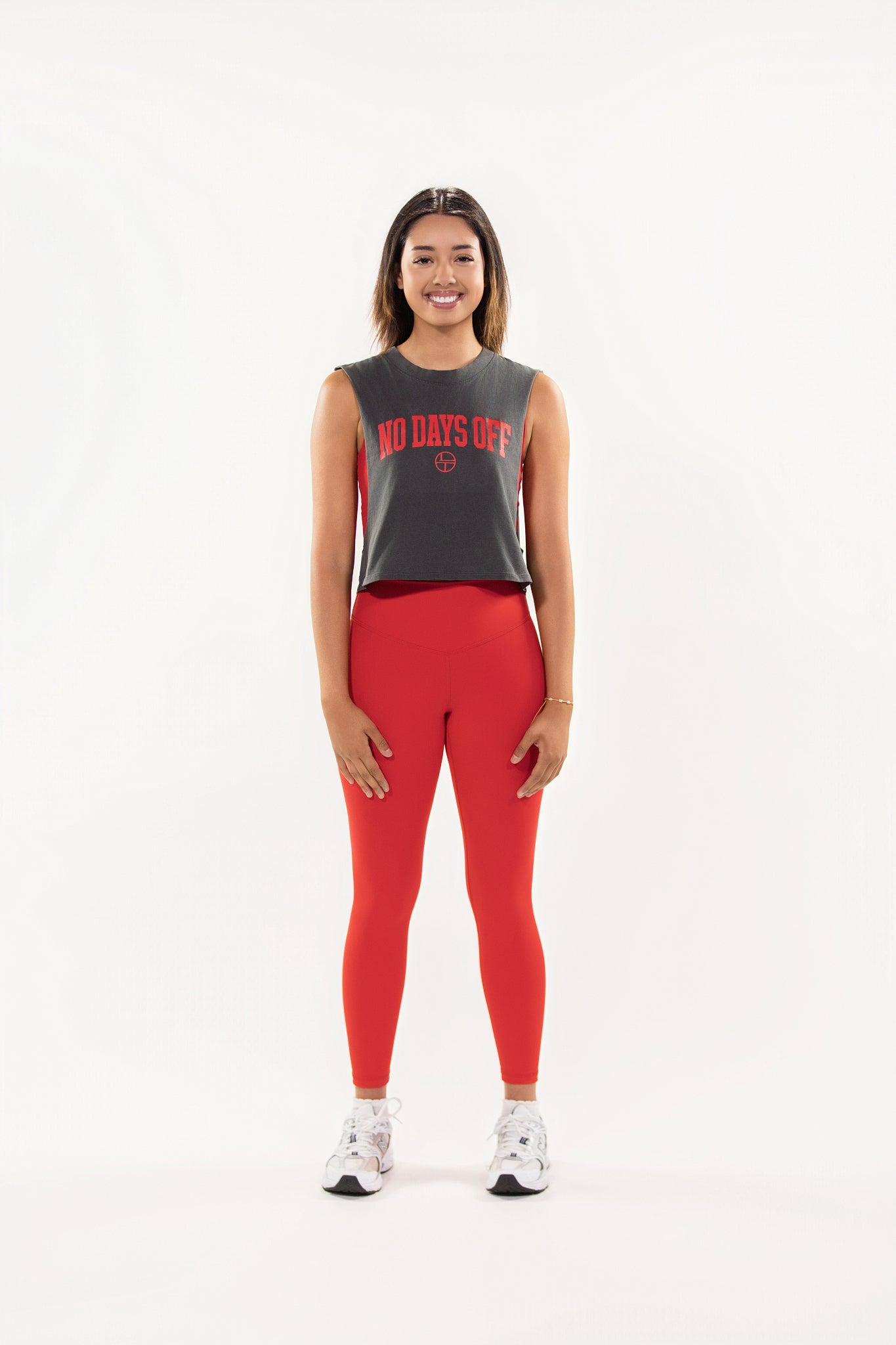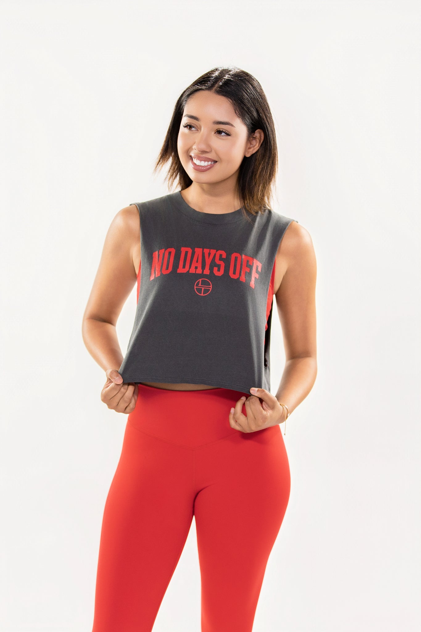 Push past limits with the NO DAYS OFF Tank. Built for those who hustle every day. Featuring a bold graphic statement across the chest, this tank delivers effortless edge with raw-cut armholes and a breathable, flattering cropped fit.